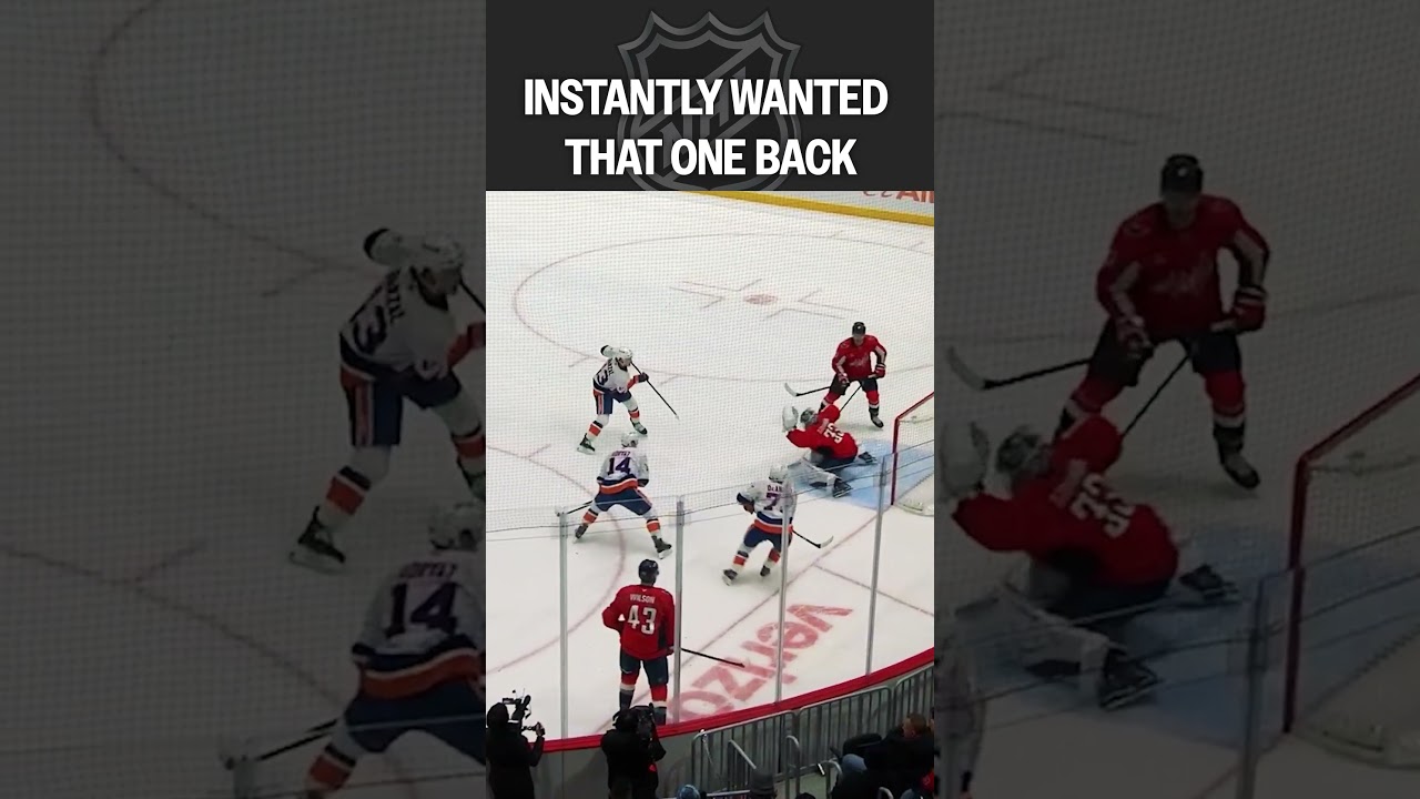 Capitals forward Tom Wilsons serves a pizza to Mathew Barzal and immediately regrets his decision, as the Islanders go up